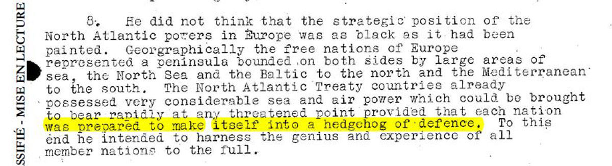 The earliest mention of the hedgehog in a NATO context was by Supreme Allied Commander Europe (SACEUR) General Dwight D. Eisenhower in January 1951 at a meeting of the Defence Planning Working Group (D-R(51)4). At this meeting, Eisenhower noted that European countries should adopt a 'hedgehog' defence to slow down enemy forces long enough for the full weight of NATO to turn the tide.