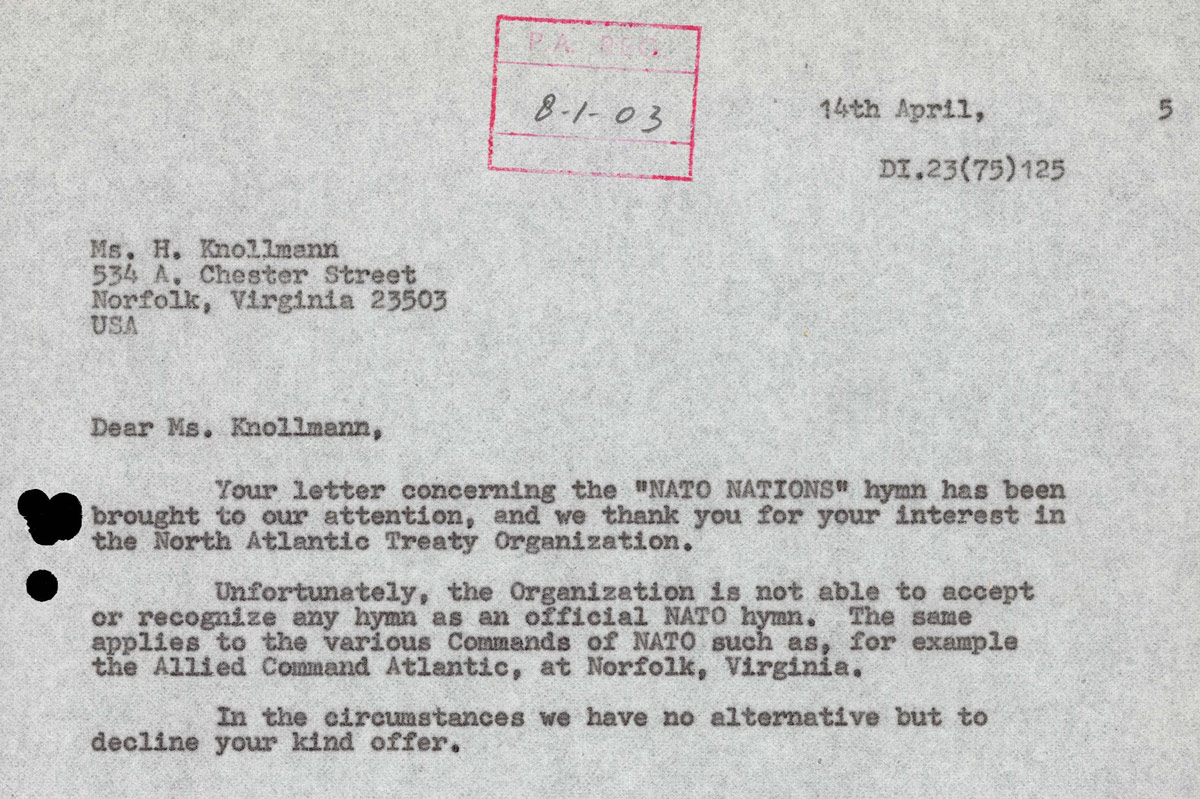 The most democratic proposal for a NATO anthem came in 1960, when Air Marshal Sir Edward Chilton (United Kingdom) suggested a NATO anthem arranged by Squadron Leader J.L. Wallace, which merged all the national anthems of the then 15 member countries. Unfortunately, no further record of this hymn exists in our archives.