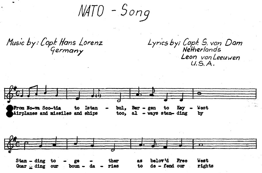 The following year, Captain Hans Lorenz (Germany) composed a “NATO Song,” (not to be confused with the "The NATO Song", created by Bing Crosby in the same year) with lyrics by Captain Stephanus van Dam (Netherlands) and Leon van Leeuwen (United States). This song was presented by an orchestra and a chorus at the NATO 10th anniversary pageant.