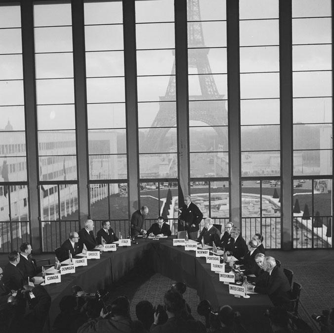 The Allies sign the Accession Protocol for Germany at NATO Headquarters, which was formerly located in Paris, in October 1954. Germany joined the Alliance in May of the following year.
