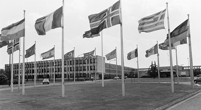 The Spanish flag flies alongside those of the other Allies at NATO Headquarters in Brussels shortly after Spain's accession to the Alliance in 1982.