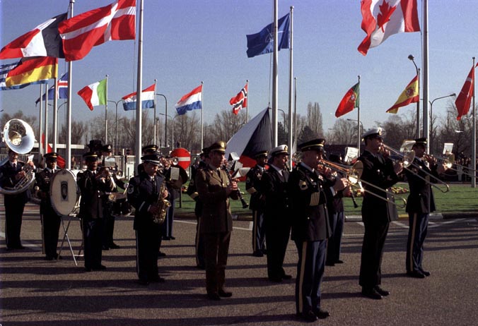 A military band performs at the flag-raising ceremony for Czechia, Hungary and Poland at NATO Headquarters in Brussels in March 1999.
