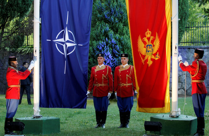 Montenegrin honour guards raise NATO's and Montenegro's flags in Podgorica, Montenegro to mark the country's accession to NATO in June 2017. © Reuters/Stevo Vasiljevic