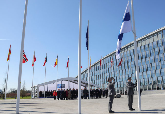 Finnish officers raise Finland's flag at NATO Headquarters in Brussels in April 2023. © Reuters/Johanna Geron/Pool