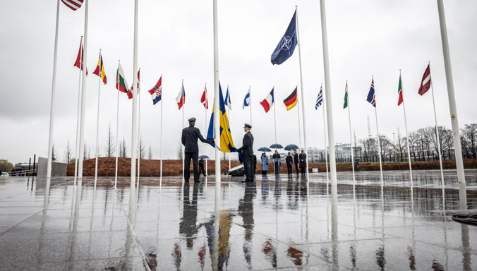 Swedish officers raise Sweden’s flag at NATO Headquarters in Brussels in March 2024.