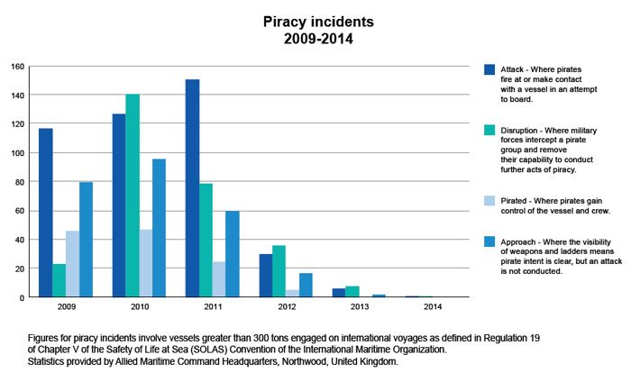 In 2014, the international efforts to counter piracy off the Horn of Africa and in the Gulf of Aden yielded continued success. The number of piracy incidents off the coast of Somalia reached its lowest in recent years; no ships have been seized since May 2012, and there were fewer than five incidents in 2014. In 2010 and 2011, there were over 120 attacks per year. NATO's Operation Ocean Shield, in close cooperation with the US-led Combined Maritime Forces, the EU Naval Forces and independent contributors to these efforts, has effectively and dramatically reduced pirate activity in the region.