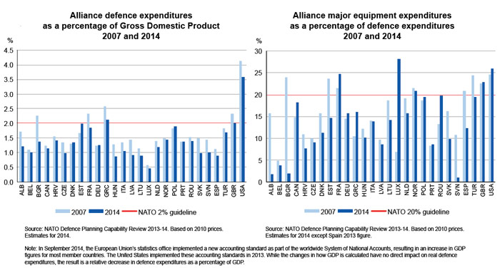 The cuts to defence expenditures, deepened by the financial crisis, diminish the options available to the Alliance and reduce the extent to which Allies equitably share responsibilities. The defence investment pledge is an important signal that Allies are committed to addressing the mismatch between challenges faced and resources available. Progress on this pledge will be reviewed annually, starting in June 2015.