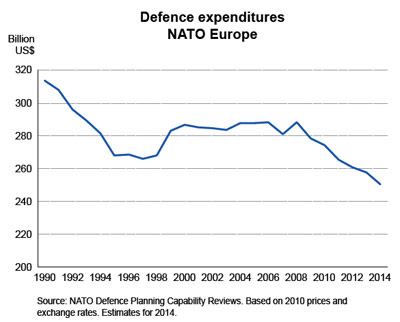 The pledge was needed because the amount of resources dedicated by Allies to defence has been on a steady decline since the end of the Cold War. In 1990, the 14 European Allies spent USD 314 billion on defence in real terms.2 By 2010, defence spending in NATO Europe had dropped to USD 275 billion, despite 12 additional European countries having joined the Alliance. In 2014, it is estimated that European members of NATO spent USD 250 billion on defence.
