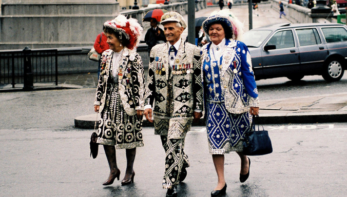 A group of 'Pearly Kings and Queens' – East London residents who sew thousands of buttons into their clothes and raise money for charities – arrives to watch the proceedings at the 1990 London Summit, a landmark summit that helped set NATO's direction after the Cold War.