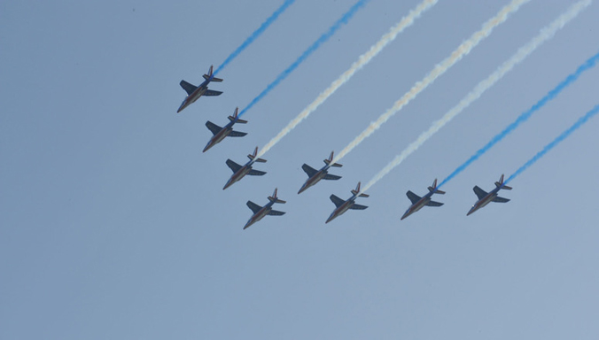 French and German airplanes fly over the 2009 Strasbourg / Kehl Summit venue, displaying the NATO colours in the sky.