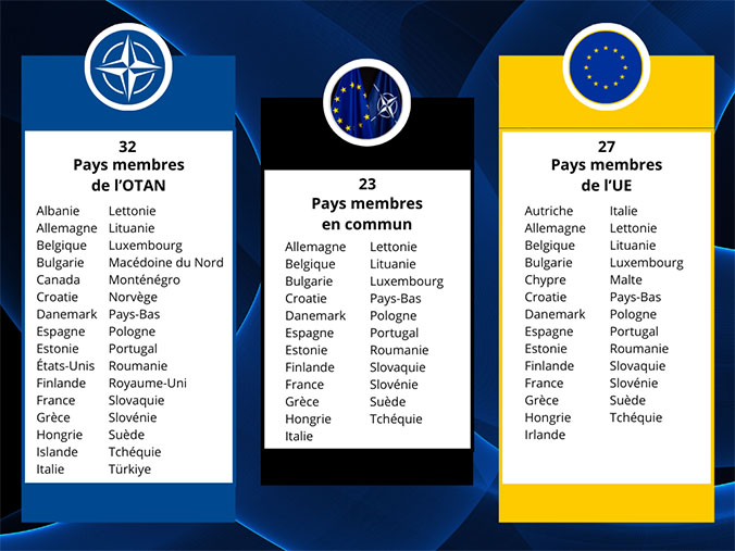 L’OTAN et l’UE ont actuellement 23 membres en commun : l’Allemagne, la Belgique, la Bulgarie, la Croatie, le Danemark, l’Espagne, l’Estonie, la Finlande, la France, la Grèce, la Hongrie, l’Italie, la Lettonie, la Lituanie, le Luxembourg, les Pays-Bas, la Pologne, le Portugal, la Roumanie, la Slovaquie, la Slovénie, la Suède et la Tchéquie.