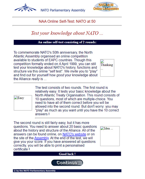 For NATO’s golden anniversary in 1999, the North Atlantic Assembly, the association of legislators from NATO member countries (now known as the NATO Parliamentary Assembly), organized an online ‘Test of Knowledge’ game – innovative for the 1990s. The retro website game and competition was open to students from NATO Allies and Partnership for Peace (PfP) countries, with the winner receiving a EUR 1,000 prize and a trip to Warsaw to attend a North Atlantic Assembly session.