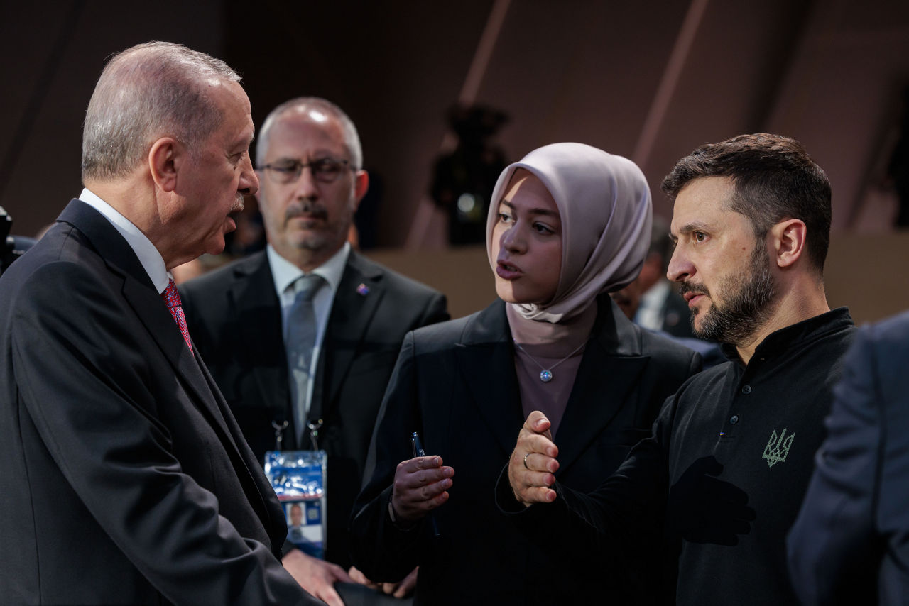 Left to right: President Recep Tayyip Erdoğan (Türkiye) talking with President Volodymyr Zelenskyy (Ukraine)