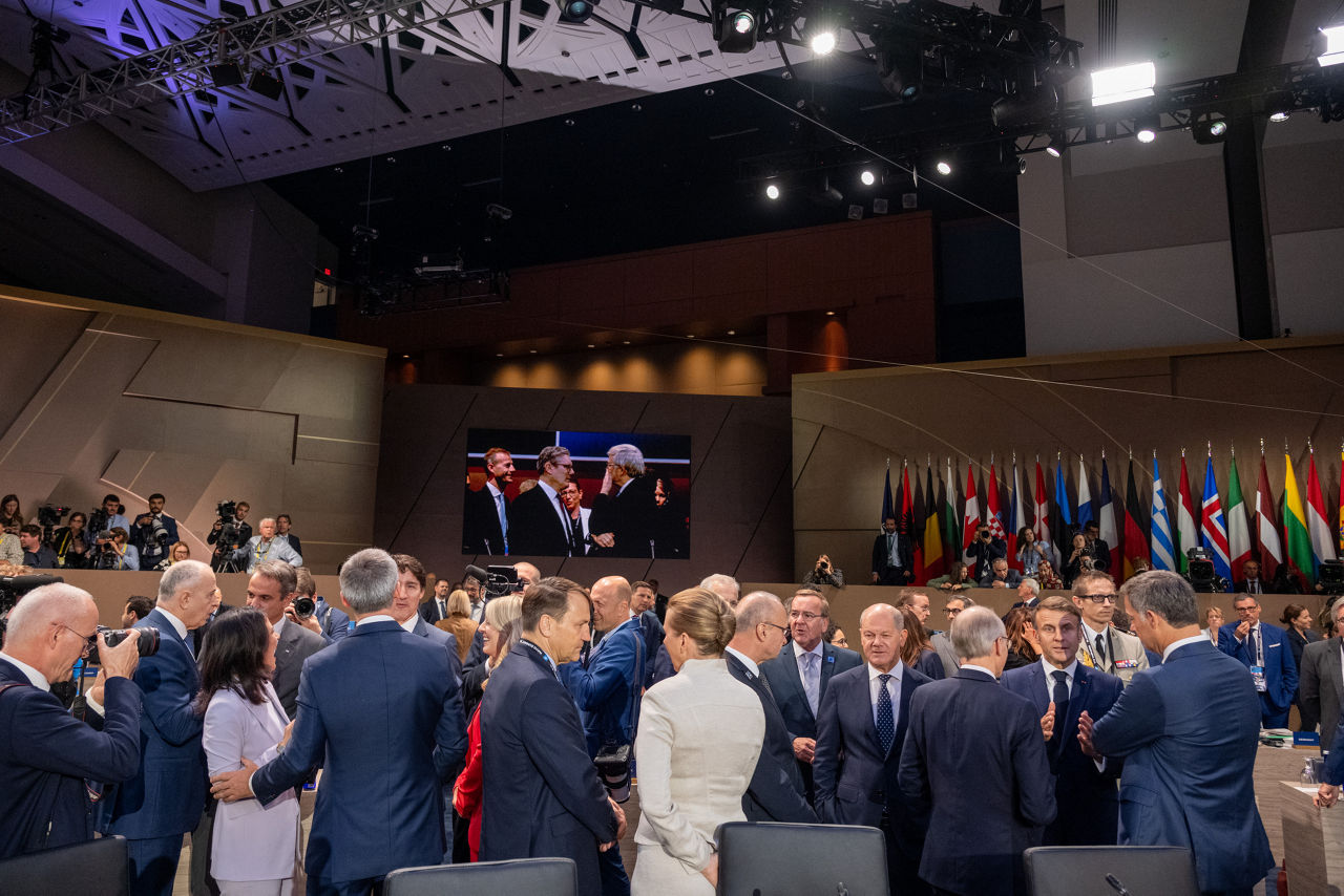 Left to right: Kyriakos Mitsotakis (Prime Minister of Greece); Ulf Kristersson (Prime Minister of Sweden): Justin Trudeau (Prime Minister of Canada); President Emmanuel Macron (France); Mélanie Joly (Minister of Foreign Affairs, Canada)
