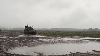 (03:39) MEDIUM SHOT - US BRADLEY FIGHTING VEHICLE MANOEUVRES OVER MUDDY AND WET TERRAIN